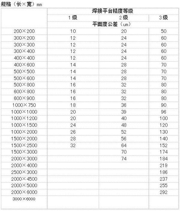 焊接平臺精度:按國家標準計量檢定規程執行,分別為1、2、3四個等級。