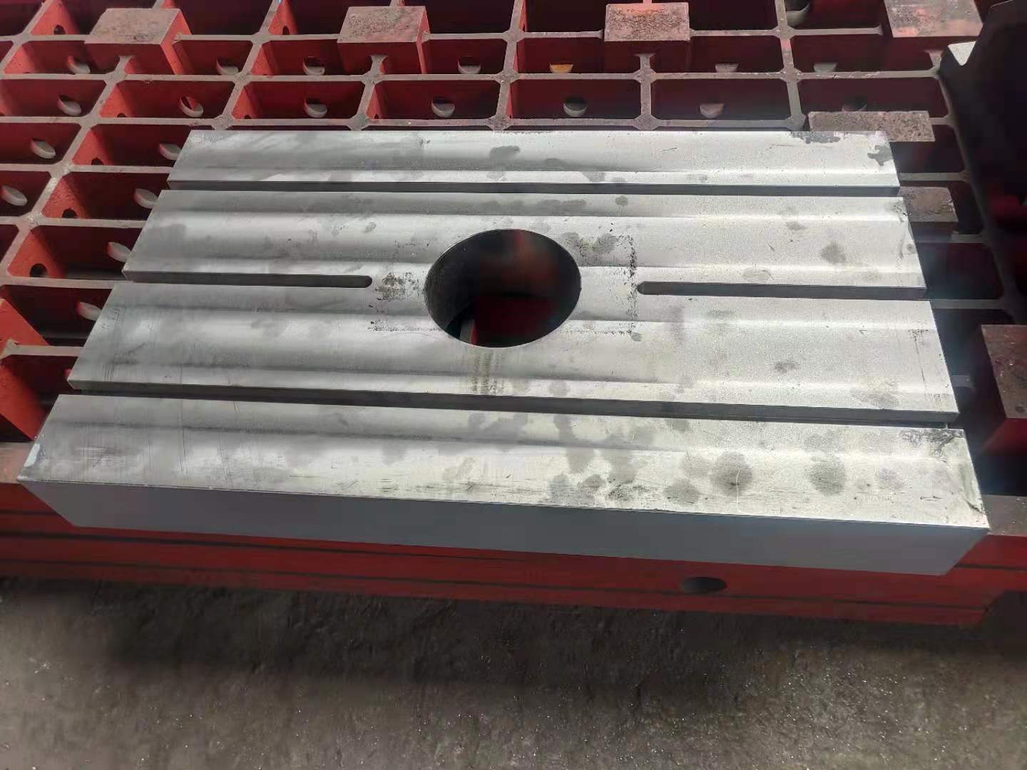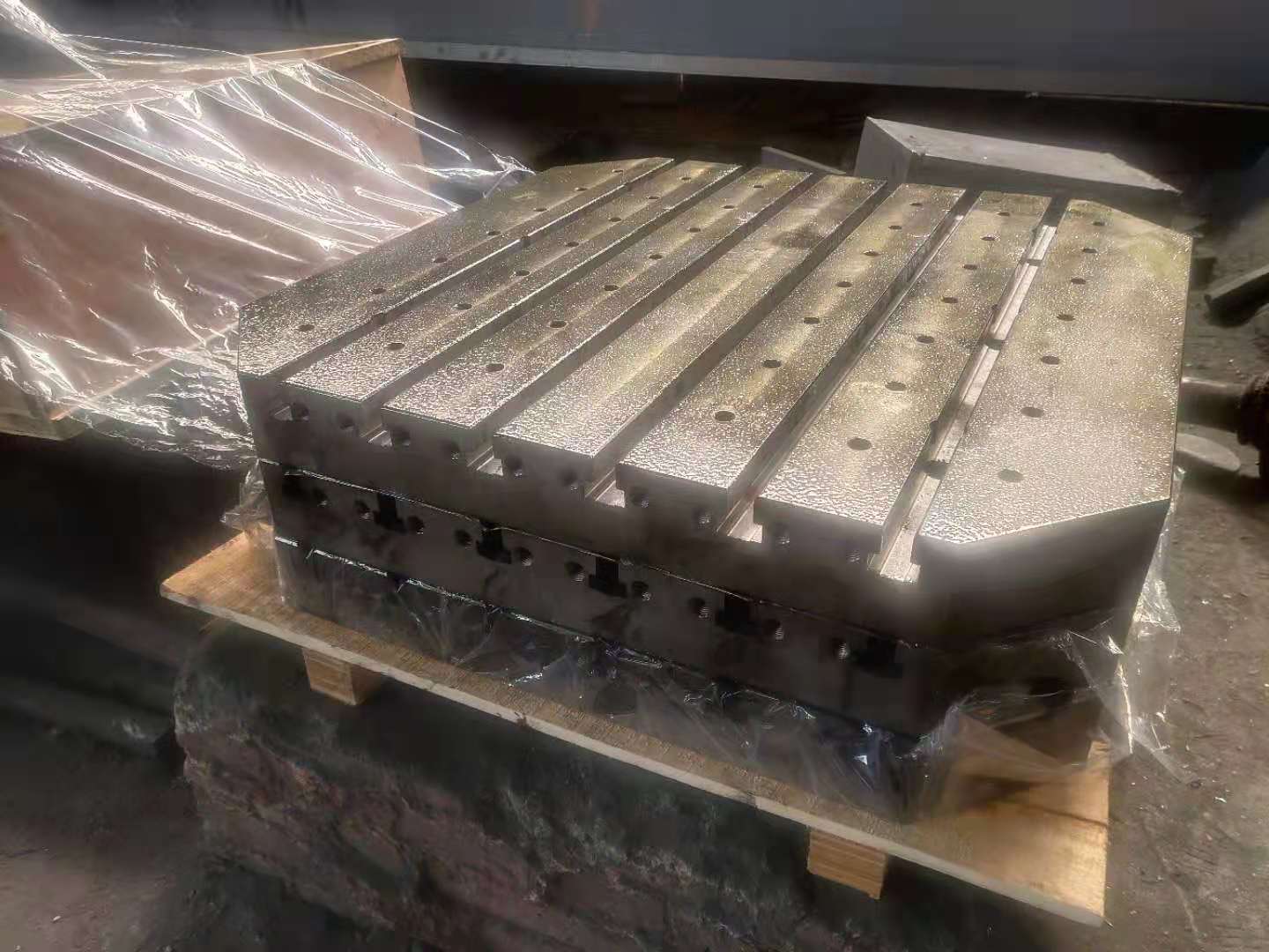加工中心工作臺采用優質灰口鑄鐵HT250-300或QT500-600鑄造加工而成,工作面可開槽打孔,鑲套,表面磨削加工。適用于各種規格立式加工中心,臥式加工中心,龍門加工中心,鏜銑床加工中心等加工設備的輔助加工工裝。