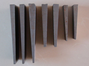 斜墊鐵的規格以及精度要求:斜墊鐵一般沒有具體規格,一般是按設備重量設計圖紙,定做加工。但常用的規格有100*50;120*60;120*80;150*80;160*80;200*100;200*120;200*150;240*120;300*150;等。斜墊鐵精度一般為△12.5,為一般粗糙精度斜墊鐵,△6.3為中級精度斜墊鐵,△3.2為高級精度斜墊鐵,△0.8為精密斜墊鐵(磨床磨削平面而成)。斜墊鐵在使用中安設備的精密度選擇墊鐵的精度。并非精度高的斜墊鐵就適合所有設備。應該按實際需要合理選擇斜墊鐵。以達到使用斜墊鐵的 初節約成本的目的。